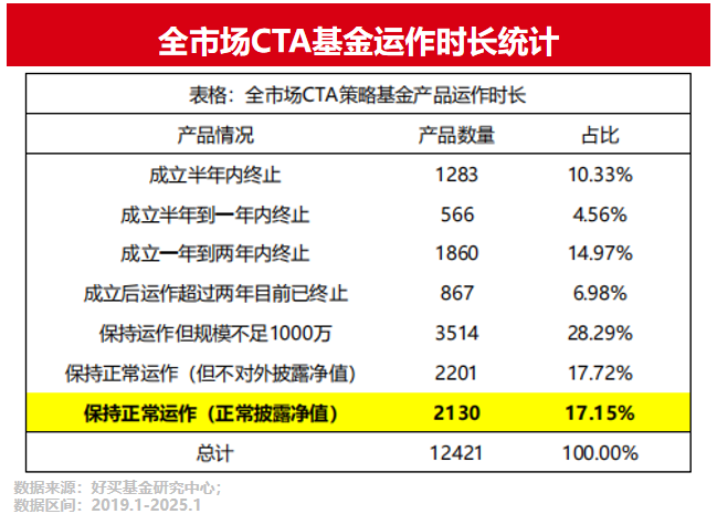 以下統(tǒng)計了2019年以來全市場CTA基金產(chǎn)品運作時長情況,產(chǎn)品成立后能運作至今,并保持凈值正常披露的產(chǎn)品數(shù)量占比僅為17.15%。