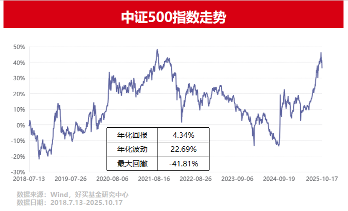 由上圖可見,中證500指數(shù)近7年來的走勢可謂波瀾壯闊,20%+的年化波動,40%+的最大回撤,投資難度很高。