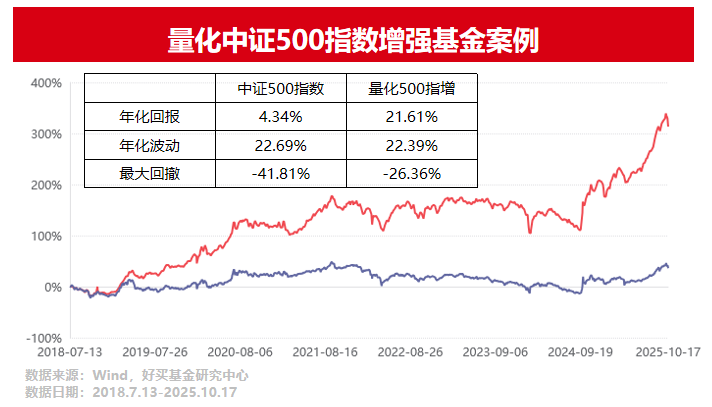 有了超額收益的加持,上圖里量化中證500指增的業(yè)績亮眼了不少。但每一次,我們都需要提醒的是,不要總是盯著21.61%的年化回報(bào),請看一看2021年到2024年趨平的業(yè)績曲線,以及數(shù)次出現(xiàn)的10%以上的回撤。